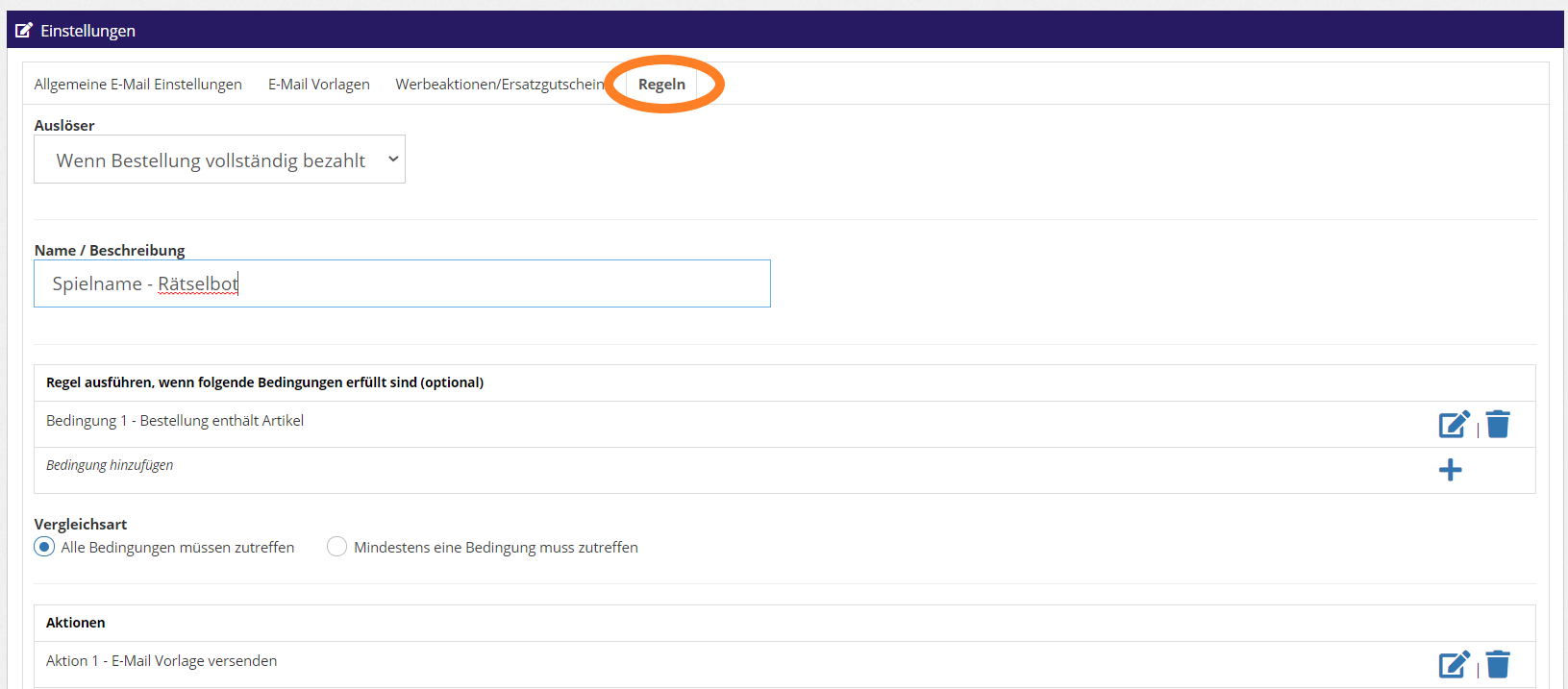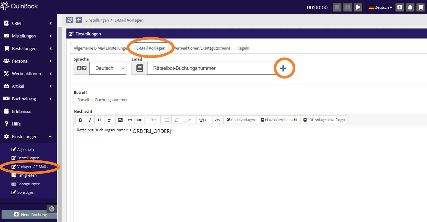 Im Buchungssystem Quinbook lässt sich die Anbindung an den Rätselbot mithilfe einer Nachrichtenregel gestalten. Dafür muss zuerst eine neue E-Mail Vorlage erstellt werden.