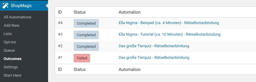 Wenn alles geklappt hat, sollten Bestellungen im Untermenü Outcomes von ShopMagic als Completed markiert sein.