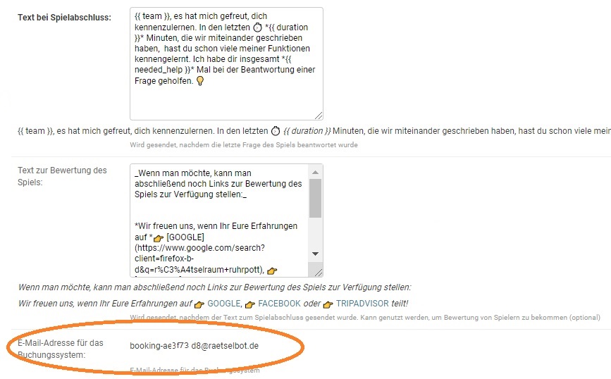 Die Anbindung von Buchungssystemen an das Backend des Rätselbots erfolgt über eine E-Mail-Schnittstelle. Pro Spiel eines Anbieters gibt es eine E-Mail-Adresse nach dem Schema booking-[a-f0-9]{8}@raetselbot.de. Bei Eingang einer Buchung ins Buchungssystem muss der Anbieter eine E-Mail an die spezifische E-Mail-Adresse für das Spiel schicken. Die E-Mail muss folgenden Text enthalten: