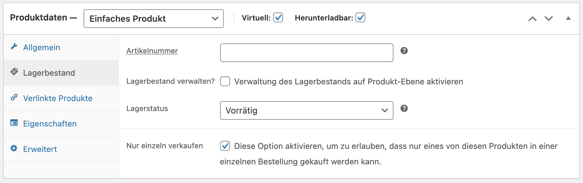 Lege in Woocommerce deine Produkte an und beachte dabei folgende Einstellungen (s. Screenshots):